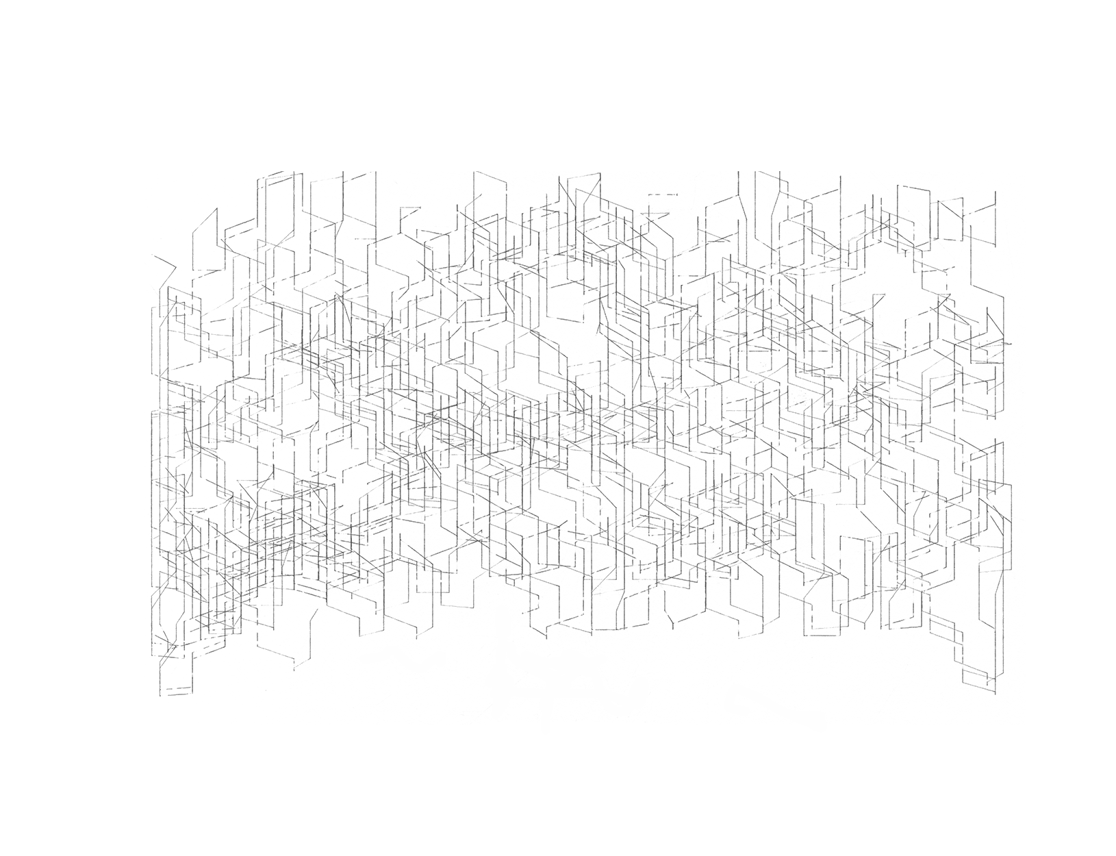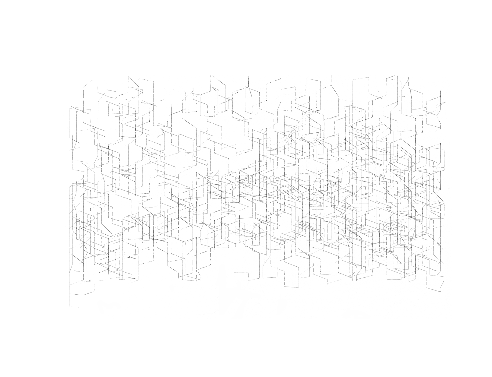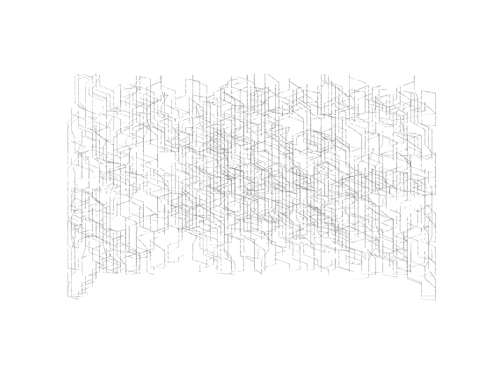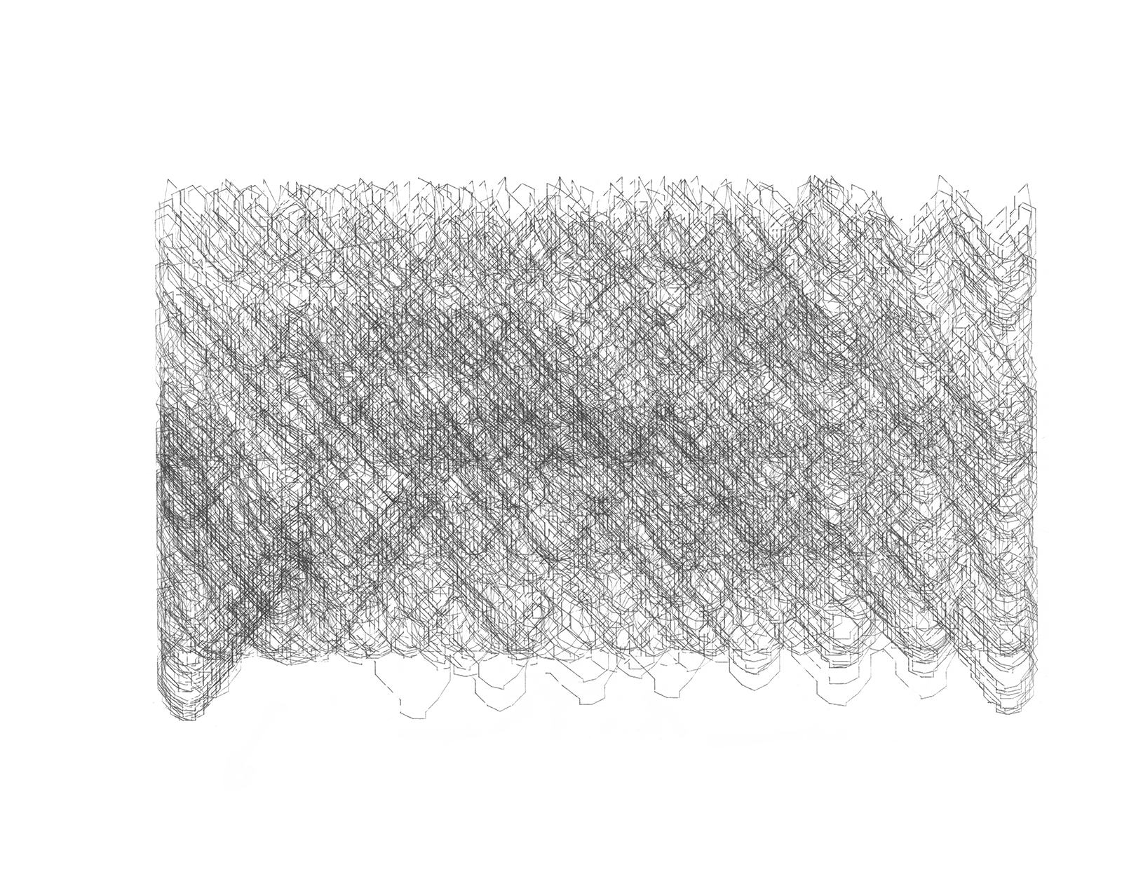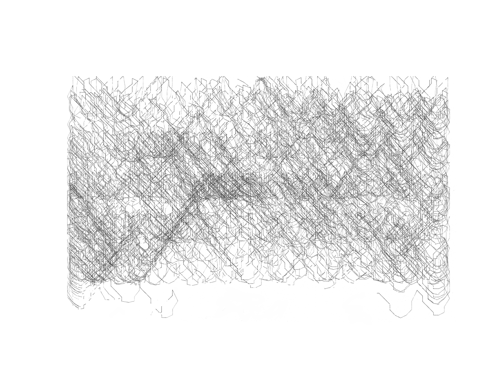 To allow the pen arm to keep up with the enemies in realtime, the plotter sampled enemy X/Y coordinates infrequently. Think sample rate reduction, but for draftsmanship. The resulting work was a collaboration between the enemies and the limitations of the pen plotter.