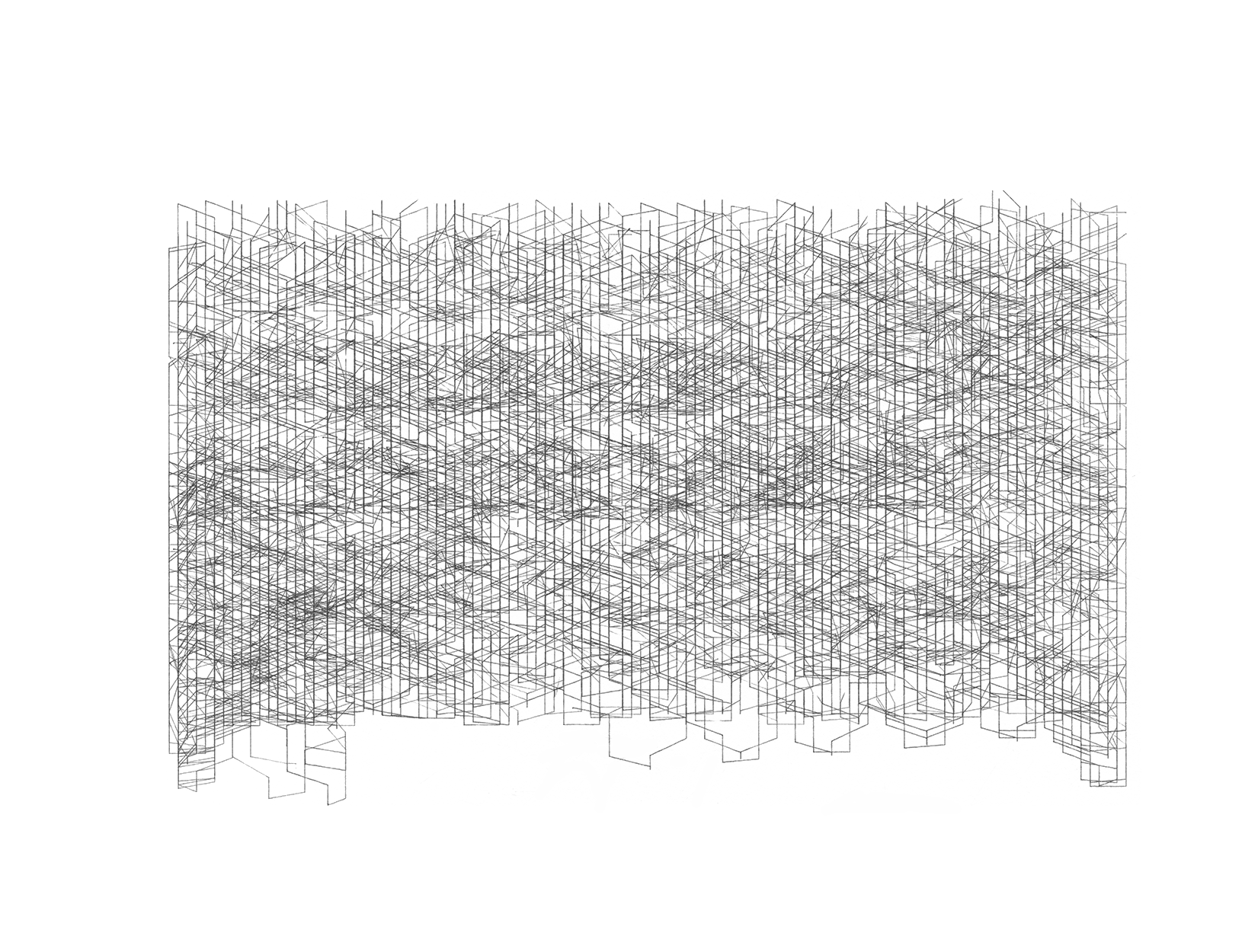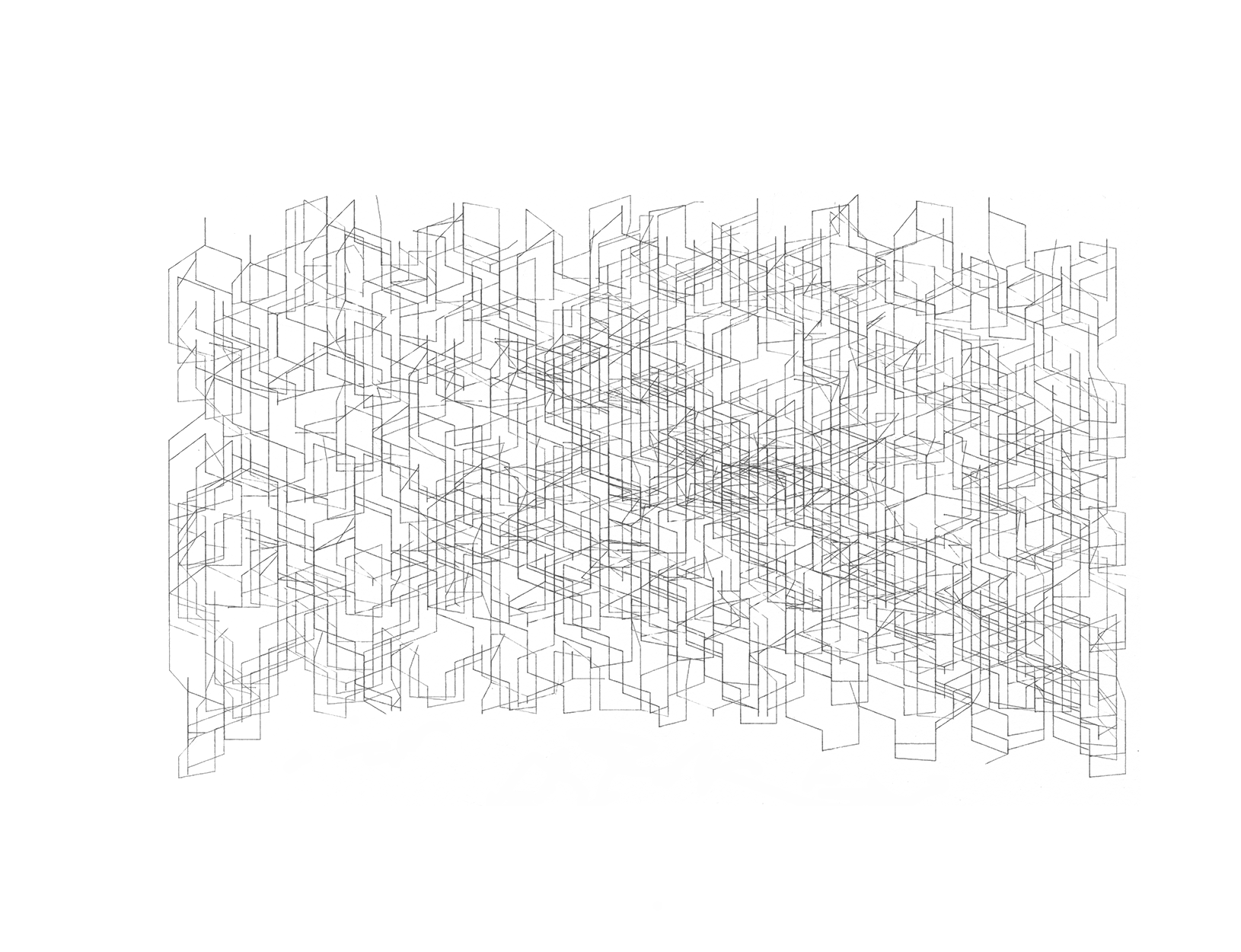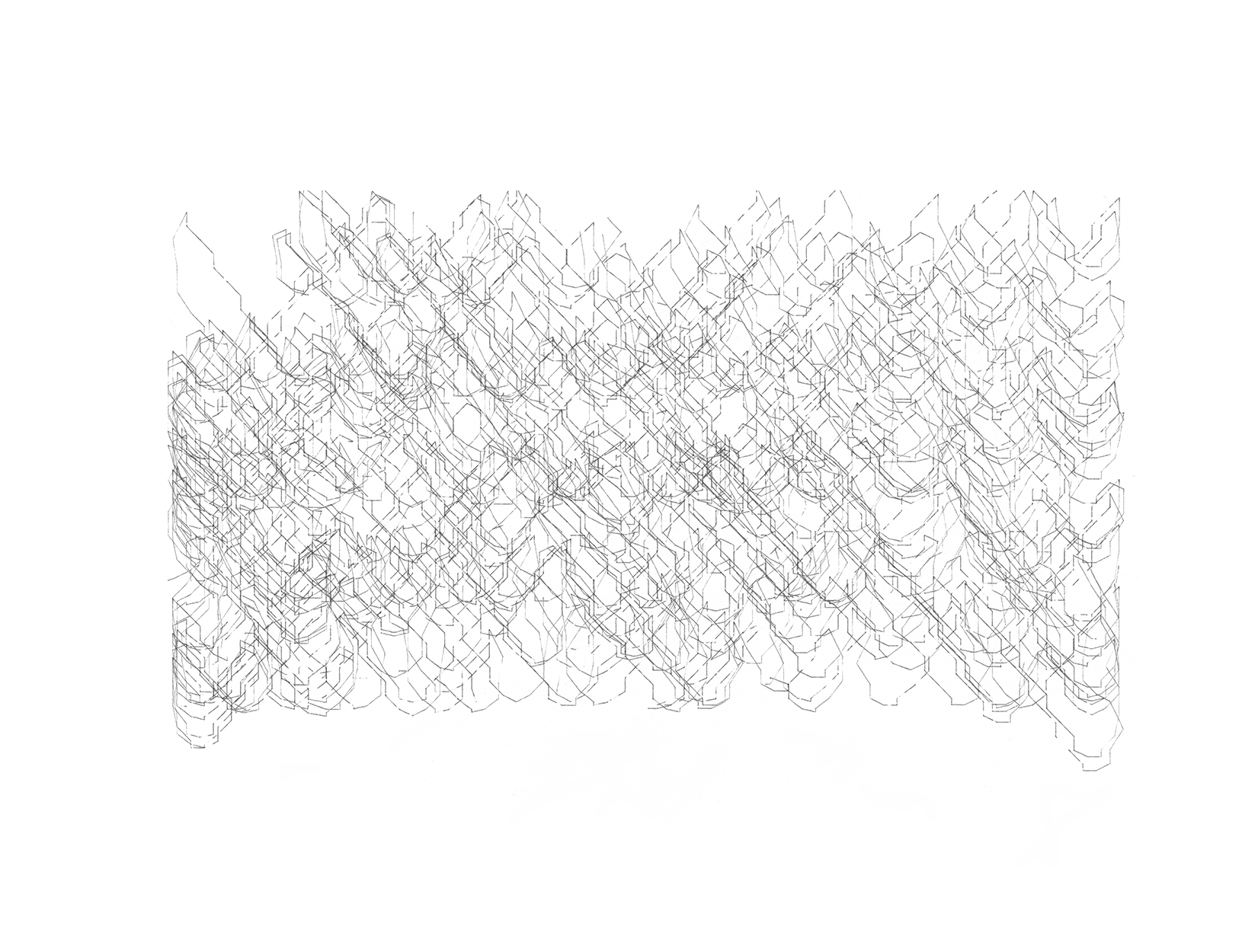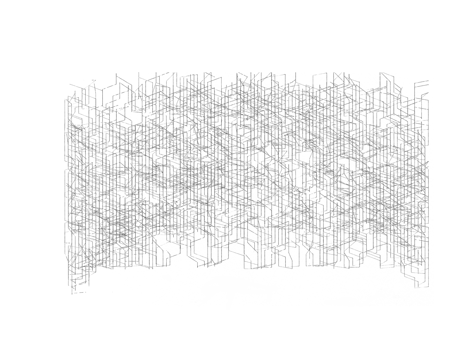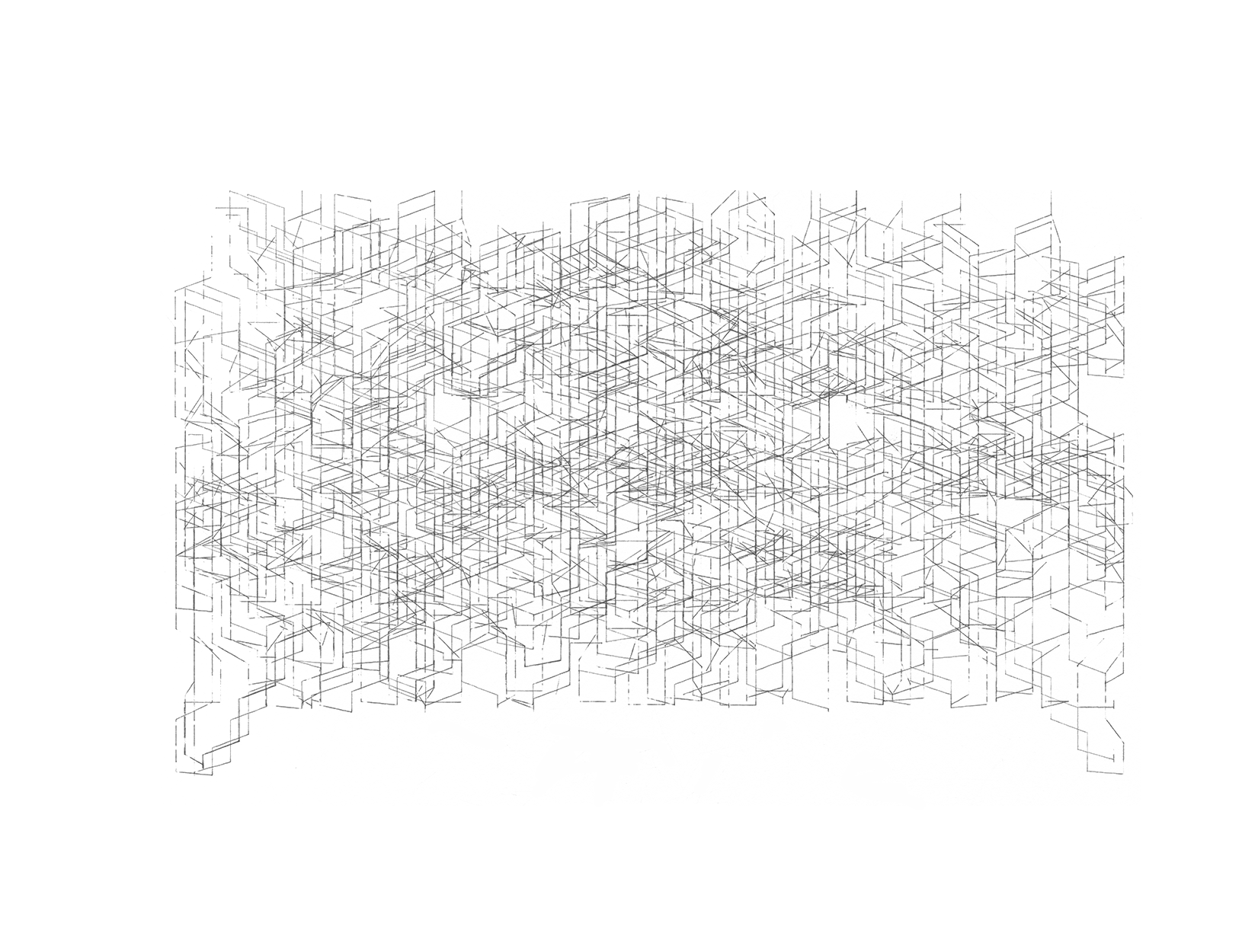 To allow the pen arm to keep up with the enemies in realtime, the plotter sampled enemy X/Y coordinates infrequently. Think sample rate reduction, but for draftsmanship. The resulting work was a collaboration between the enemies and the limitations of the pen plotter.